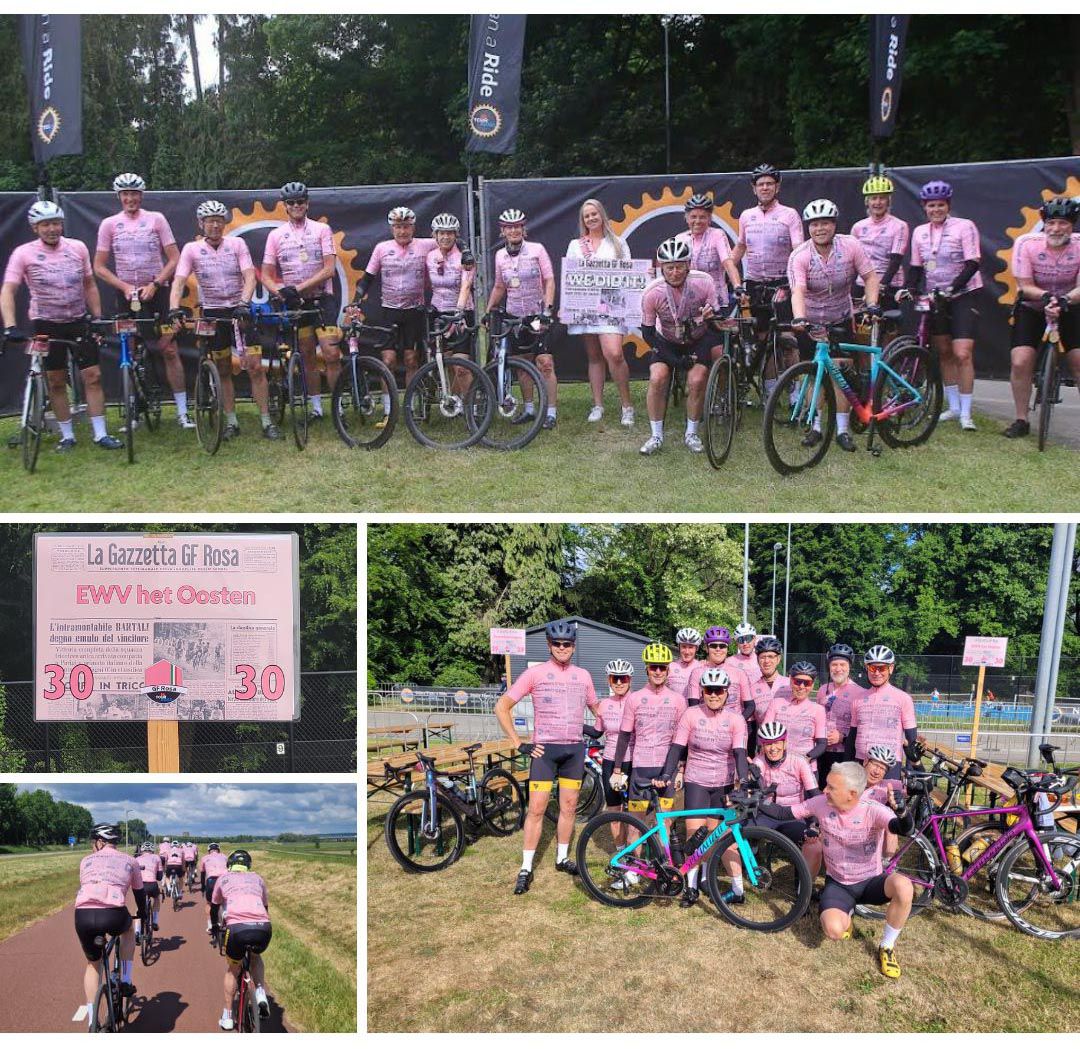 Zondag 18 mei kleurde EWV plotseling roze. 14 van onze leden reden de 120 kilometer GF Rosa route reden – in bijpassend roze shirt natuurlijk! Een bonte stoet van mannen én vrouwen trok eropuit voor een dag op de pedalen.