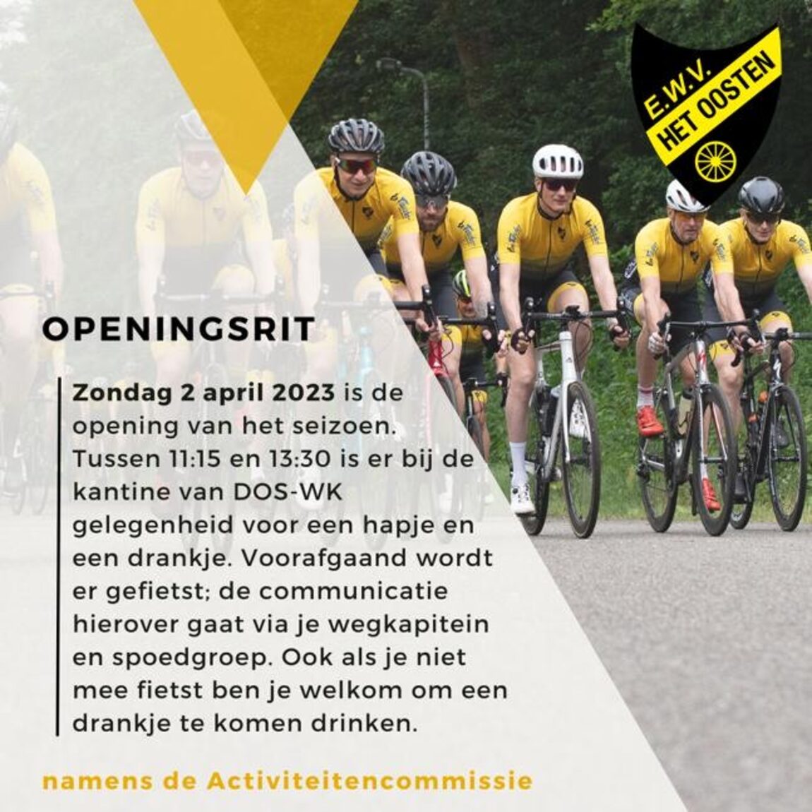 Op zondag 2 april fietsen we met de club de openingsrit van het nieuwe seizoen 2023. Iedere groep fiets een eigen route en afstand. We sluiten af in het clubhuis van DosWK met een hapje en een drankje.