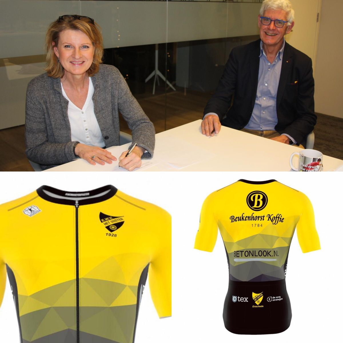 De wieleroutfit van EWV het Oosten heeft een behoorlijke metamorfose ondergaan. Shirt en broek zijn moderner en eigentijdser gemaakt. In aanloop naar het 100-jarig bestaan gaan we terug naar de oorspronkelijke clubkleuren: geel en zwart. De 4 nieuwe sponsoren hebben uiteraard ook een plekje op het shirt gekregen. Onder het tabblad Clubkleding is informatie beschikbaar voor leden omtrent de bestelprocedure. Op de foto: Annemiek Everink van C-tex bij ondertekening van sponsorcontract met de voorzitter Ger Vergeer.